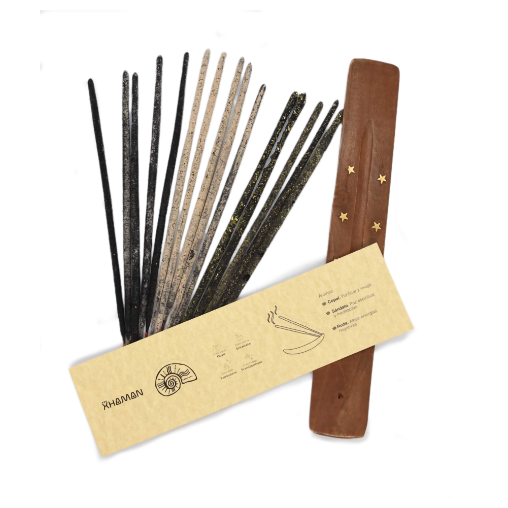 ¿No sabes por cuál incienso decidirte? ¡No te preocupes! Este set trae lo mejor de tres mundos: Copal, Sándalo y Ruda, cada uno con su propia energía y propósito. Todo viene en un empaque de diseño original Xhaman, hecho 100% de papel y libre de adhesivos, porque cuidamos cada detalle, incluso el que envuelve tu experiencia.